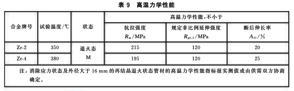 3.4.2 需方要求并在合同中注明時(shí),Zr-2和Zr-4管材可進(jìn)行高溫力學(xué)性能檢驗(yàn)。外徑不大于16mm管材的高溫力學(xué)性能應(yīng)符合表9的規(guī)定。